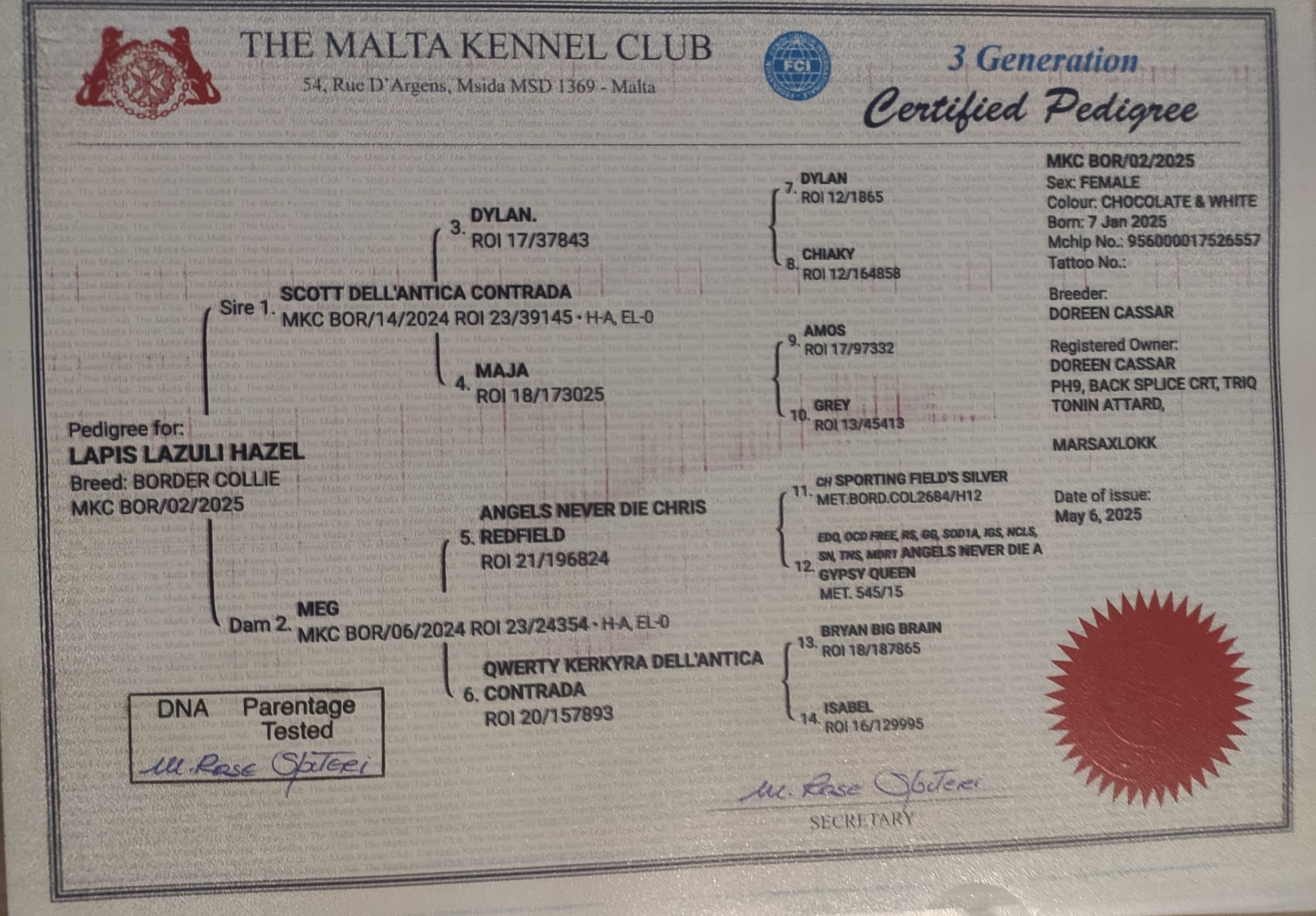 We believe in complete transparency when it comes to the health of the dogs. Here you can explore the pedigrees and health test results for Meg, Scott, Hazel and Echo, including certified hip and elbow dysplasia evaluations, breed-specific genetic testing for Border Collies, and comprehensive DNA profiling – all to ensure the best possible start for their puppies.